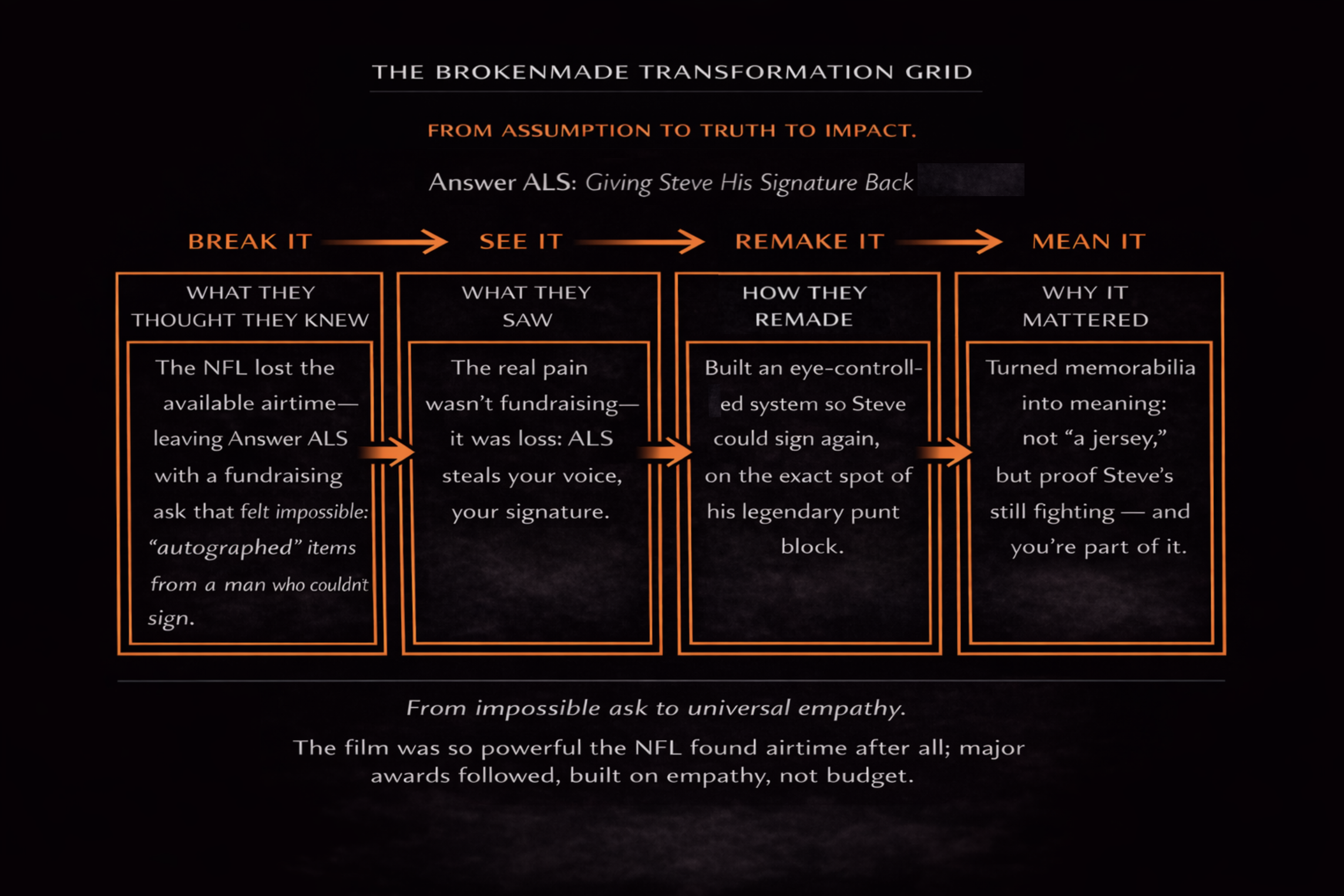 More than a decade ago, a creative brief to brand Answer ALS landed on my desk, and it changed my life and my family’s lives in ways I never could have imagined. You could say their organization is “BrokenMade to its core.” Steve Gleason and Answer ALS Managing Director Clare Durrett have been profound inspirations to us and are a big part of why The BrokenMade Method™ was born.